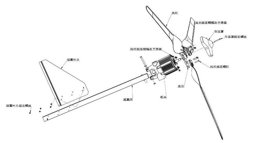 8、采用自動對風(fēng)裝置,使風(fēng)力發(fā)電機(jī)自動調(diào)整對準(zhǔn)迎風(fēng)方向,兼顧調(diào)向靈敏性和穩(wěn)定性,風(fēng)力較大情況下發(fā)電機(jī)尾翼斜置限速保護(hù)風(fēng)機(jī)不受損。